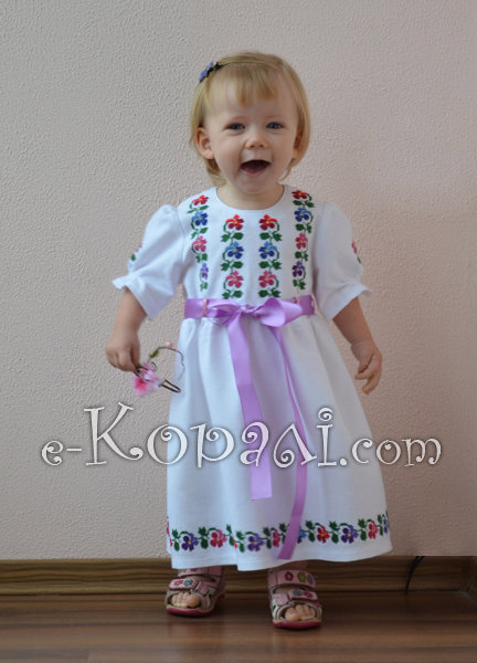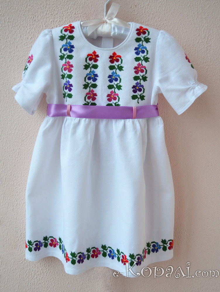 Тканина - "домоткане" полотно (100% бавовна). Вишивка хрестиком нитками DMC (9 кольорів). Пояс - атласна стрічка (колір можна обрати за бажанням). р. 80-92.