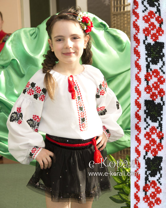 Тканина - домоткане полотно (100% бавовна). Вишивка хрестиком нитками муліне DMC. Рукави зібрані "пухликами", горловина обгачкована і стягується на шнурочок з китичками.