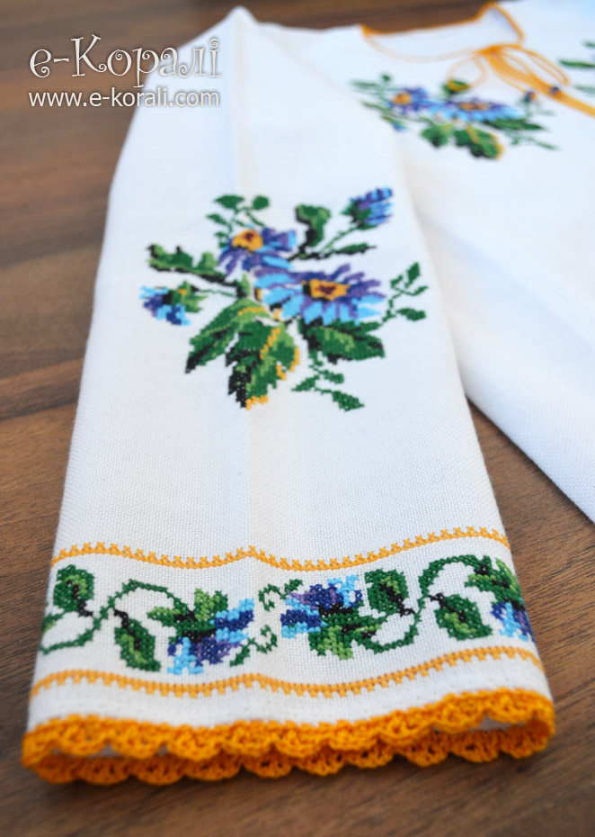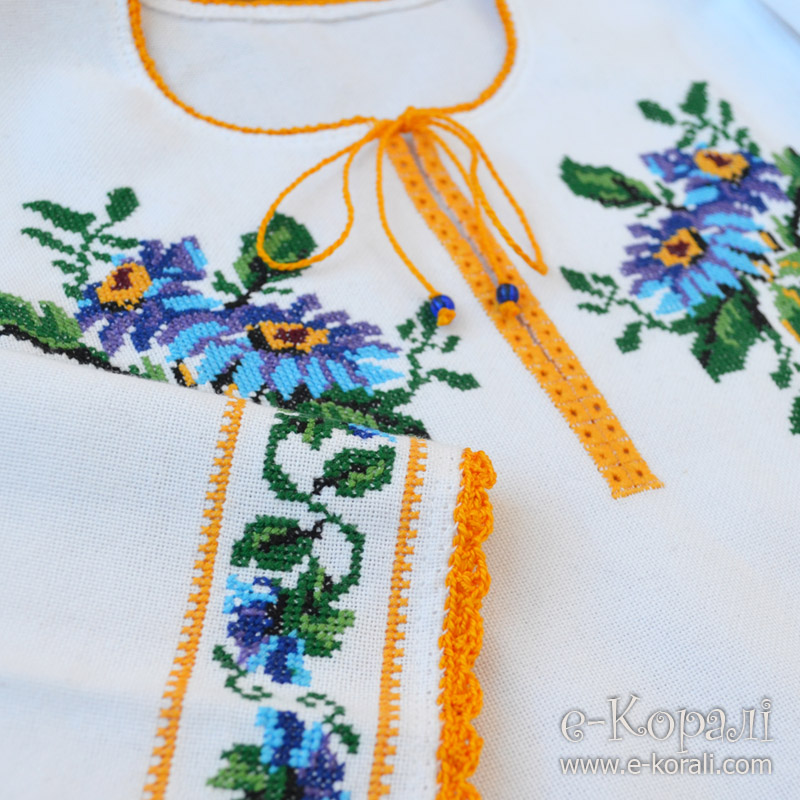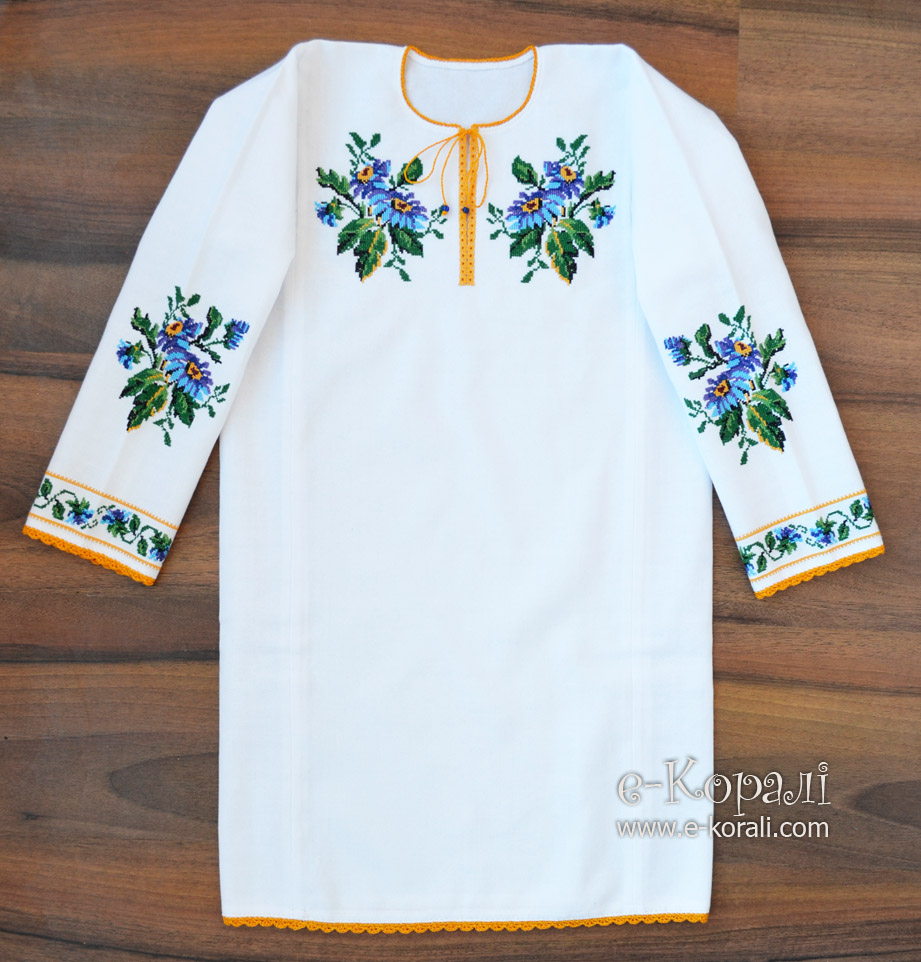 Старовинний тунікоподібний крій, вишивка хрестиком, "солов'їні вічка", вручну обгачковані краї. За основу взято візерунок зі старої дівочої вишиванки (Кременецький р-н Тернопільської обл.). Тканина - домоткане полотно (100% бавовна), нитки - муліне DMC.