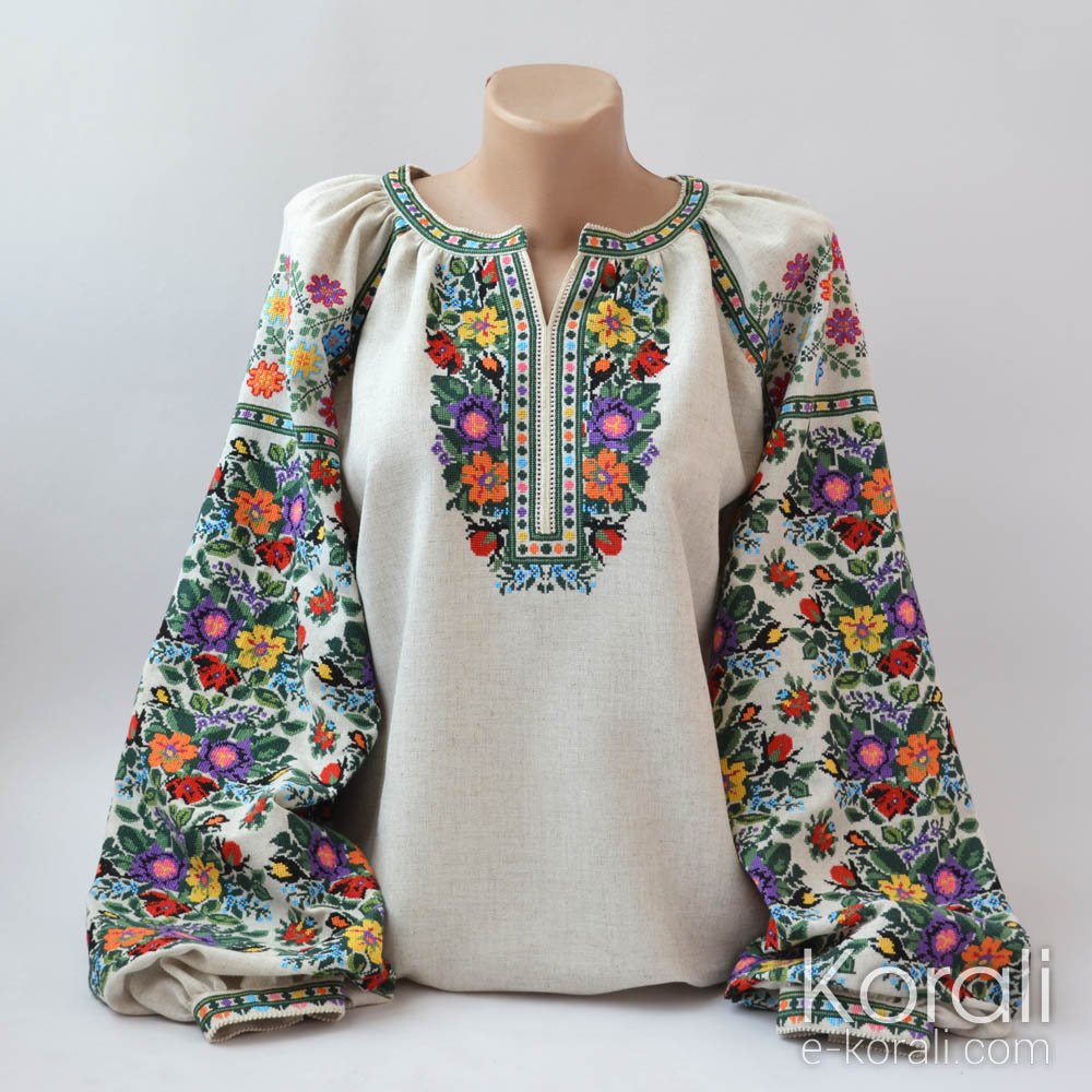 Жіноча вишиванка за мотивами борщівських сорочок. Традиційний уставковий крій. Тканина - Zweigart Murano(на фото молочного кольору, є також варіант білого кольору). Склад тканини: 52% бавовна, 48% модал. Вишивка виконана у техніці косий хрестик нитками муліне DMC, 12 кольорів.