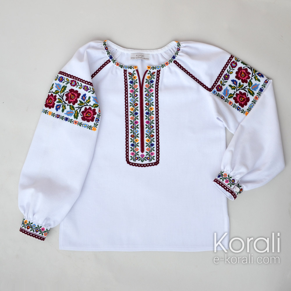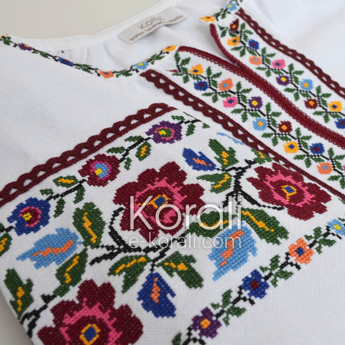 З давніх давен дитячий одяг прикрашали квітами. Ми доповнили яскраву вишивку бавовняним мереживом в тон і отримали стильну сучасну блузку для дівчинки.