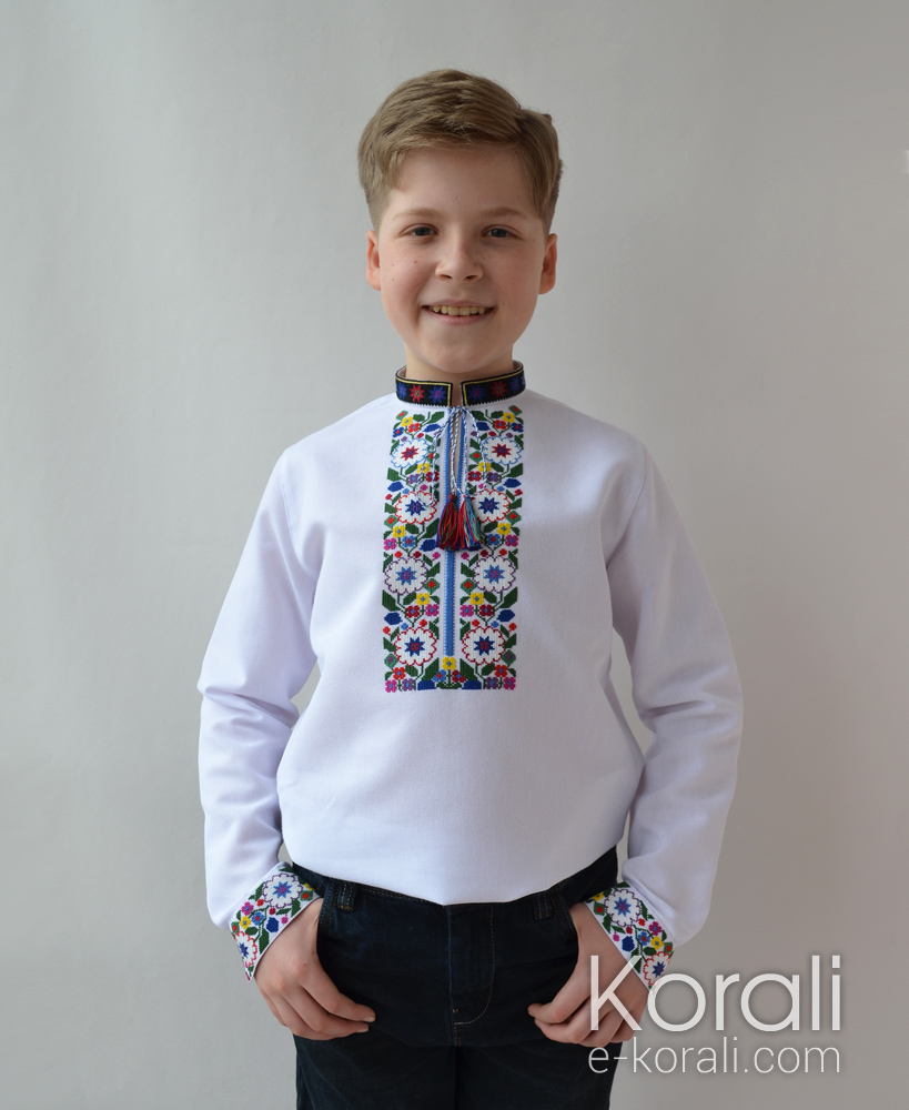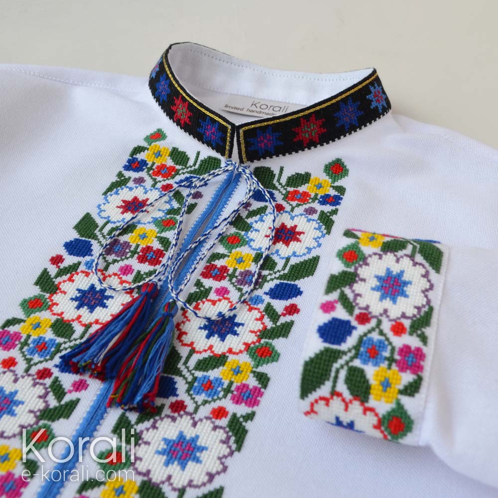 Вишивка хрестиком за мотивами борщівських сорочок на 11 кольорів та шиття металізованою золотистою ниткою на акцентному комірці-стійці. Тканина - льон/бавовна.