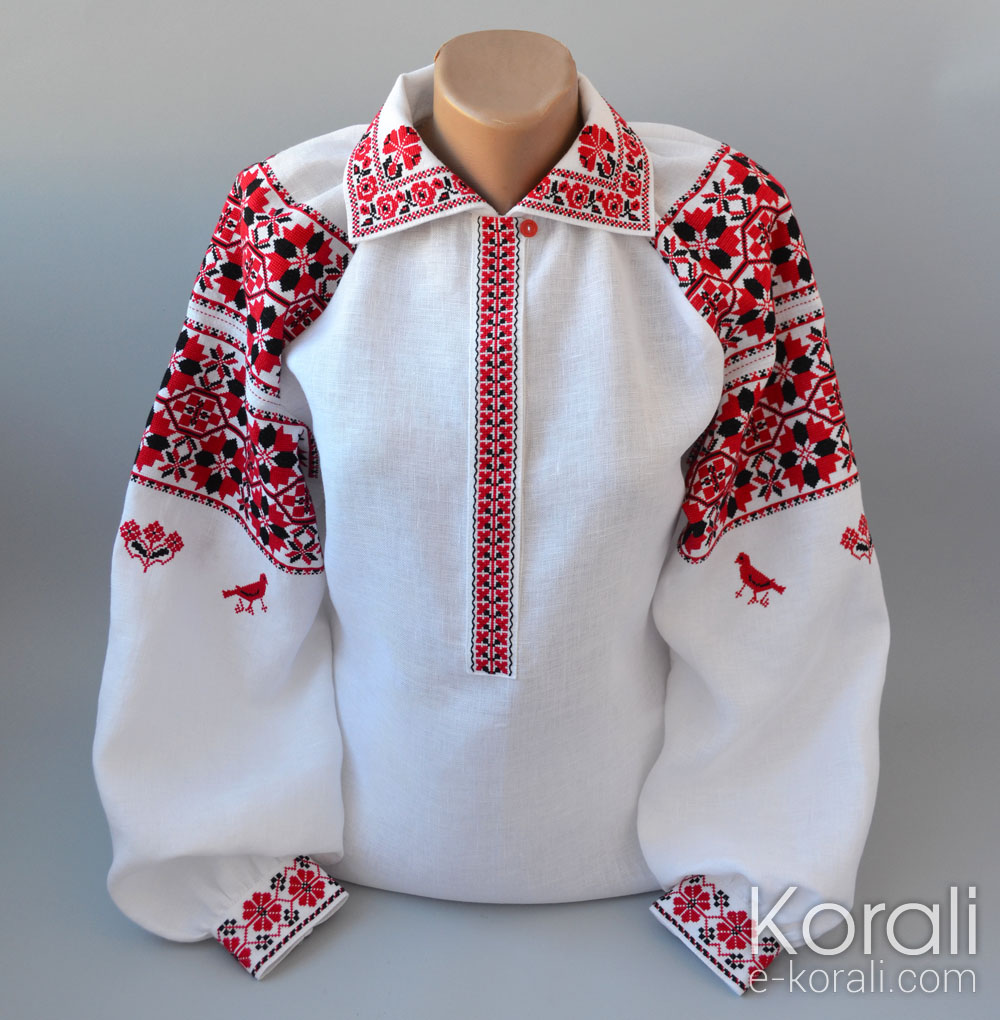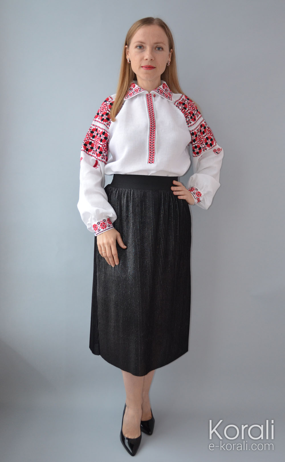 Сорочка відшита від старовинної жіночої вишиванки з Волинського Полісся. Традиційний уставковий крій з відкладним комірцем. Пазушний розріз закриває вишита планка. Техніки ручної вишивки: хрестик, кривулька, шов уперед голку. Нитки: муліне DMC червоного та чорного кольору.