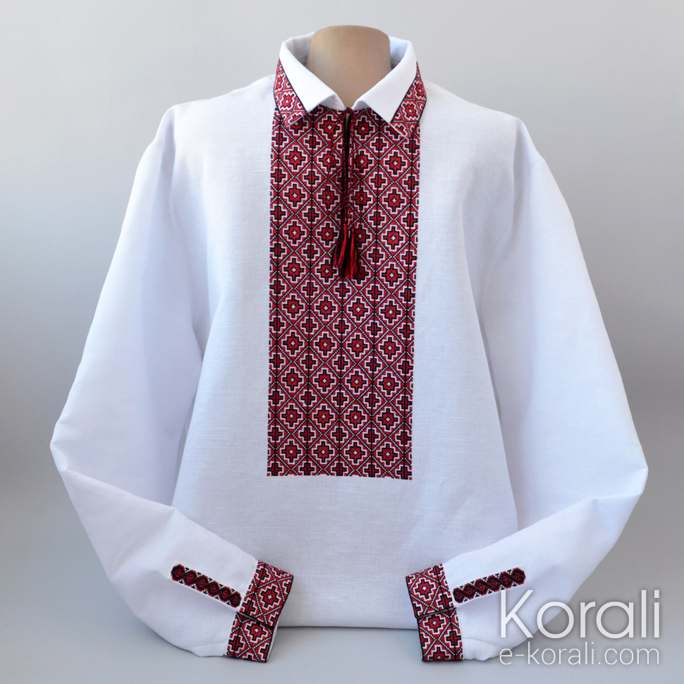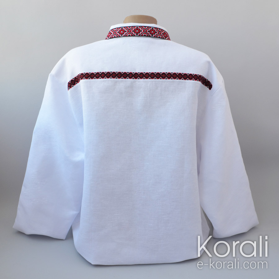 Сорочка прямого фасону з старовинними геометричними орнаментами, притаманними заходу України. Ручна вишивка у техніці хрестик нитками муліне DMC. Крім традиційного оздоблення пазухи, манжетів та комірця-стійки, у даній моделі вишивка присутня також на спинці та внизу рукава.