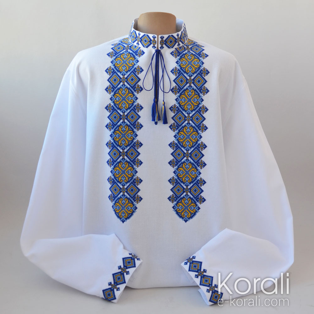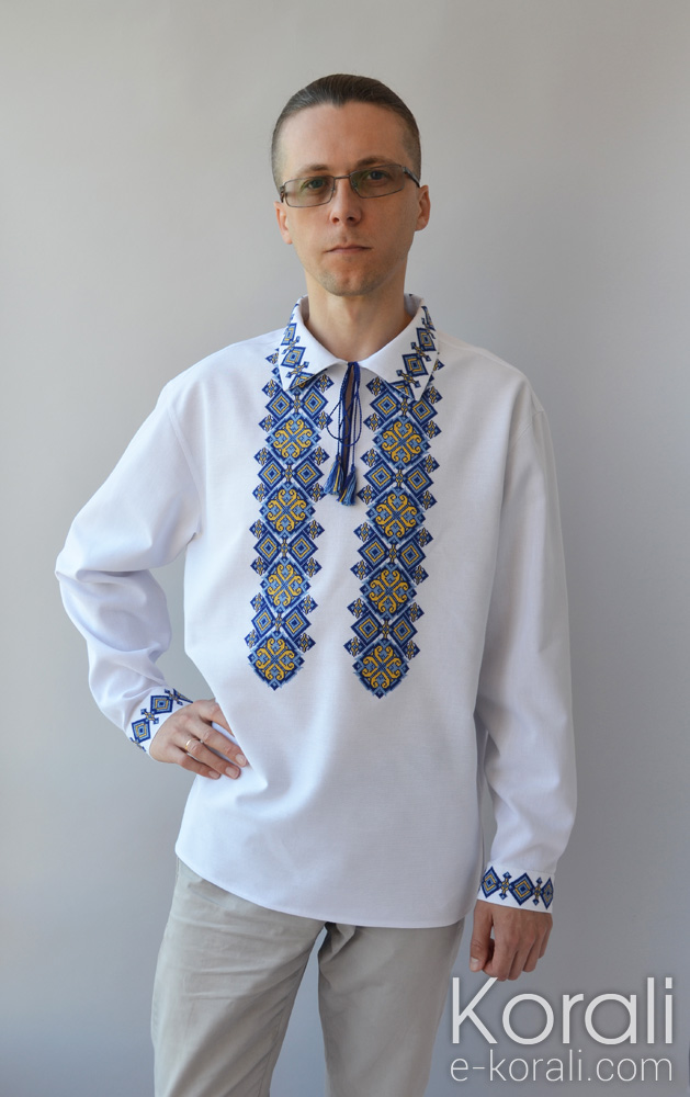 Вишиванка прямого фасону. Тканина - льон 62%, поліестер 20%, бавовна 18%. Можливе виготовлення з 100% льону або 100% бавовни. Вишивка хрестиком нитками муліне DMC. Ручна робота.